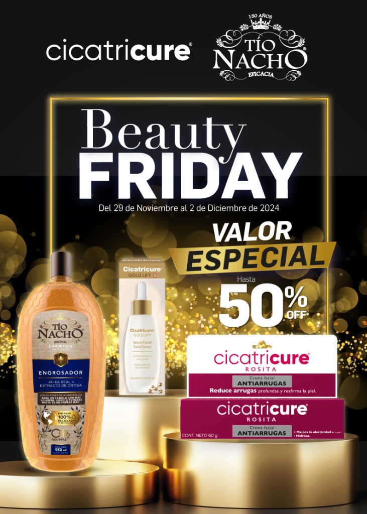 Leer indicaciones y demás recomendaciones en el empaque de cada producto. Resultados pueden variar de persona a persona. La promoción aplica así: *El 50% de descuento aplica, para autoservicios seleccionados, únicamente en: Cicatrice Sérum Gold Lift 27ml (3.000 unidades), Cicatricure Eye Cream For Face 30g (2.421 unidades). El 25% de descuento aplica para Cicatricure contorno de ojos Blur-Filler 15g (4.633 unidades disponibles), Cicatricure Gold Crema de día 50g (4.138 unidades disponibles), Cicatricure Gold crema de noche 50g (3.354 unidades disponibles) Cicatricure Gold Contorno Dúo 15g (1.277 unidades disponibles), Cicatricure Crema Antiarrugas 60gr (4.484 unidades disponibles), Cicatricure Crema Anti-manchas 50gr (6.0284 unidades disponibles), Cicatricure Sérum Antiarrugas 30ml (944 unidades disponibles). El 20% aplica para Tío Nacho Tío Nacho Shampoo Engrosador 950ml (9.660 unidades disponibles), Tío Nacho Shampoo Herbolaria Milenaria 950ml (7.210 unidades disponibles), Tío Nacho Shampoo Aclarante 950ml (7.007 unidades disponibles), Tío Nacho Shampoo Anti-Canas 950ml (5.535 unidades disponibles), Tío Nacho Shampoo Herbolaria 1 litro (2.012 unidades disponibles), Tío Nacho Shampoo Engrosador 1 litro (2.002 unidades disponibles), Tío Nacho Shampoo Jalea Real 1 litro (1.923 unidades disponibles), Tío Nacho Shampoo Anti-Canas 1 litro (1.913 unidades disponibles). Para cadenas de farmacias seleccionados el 50% aplica únicamente para Cicatricure Eye Cream For Face 30g (2.532 unidades). El 25% de descuento aplica para Cicatrice Sérum Gold Lift 27ml (2.462 unidades), Cicatricure Gold Crema de día 50g (6.282 unidades disponibles), Cicatricure Gold crema de noche 50g (3.977 unidades disponibles) Cicatricure Gold Contorno Dúo 15g (3.510 unidades disponibles). El 15% aplica para Tío Nacho Shampoo Engrosador 1 litro (3.908 unidades disponibles), Tío Nacho Shampoo Anti-Canas 1 litro (1.066 unidades disponibles), Tío Nacho Shampoo Herbolaria 1 litro (1.272 unidades disponibles), Tío Nacho Shampoo Aclarante 1 litro (1.756 unidades disponibles). Promoción válida del 29 de noviembre al 02 de diciembre de 2024, o hasta agotar existencias, lo que ocurra primero. No es acumulable con otra promoción/oferta, no aplica para packs armados. El número total de unidad por producto, destinados a promoción, será distribuido entre todos los canales de venta citados. No es acumulable con otra promoción/oferta. Mayor información Bogotá 601 592 4569 – Resto del país 01-800-952-0777.